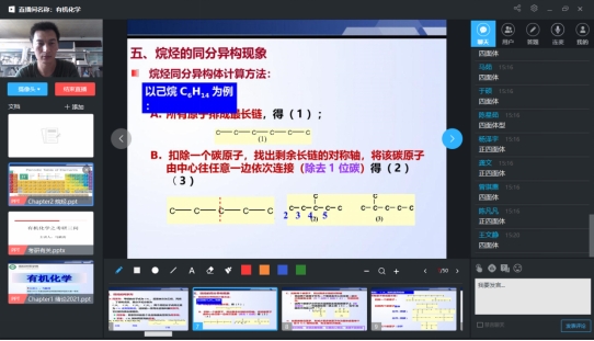 由于《有机化学》是化学专业的基础必修课,四大专业基础课之一,对于培养合格的化学专业人才具有重要的意义。因此,为了保证上课效果,本人决定采用直播的方式上课。自8月24日开始,按照学校和学院的整体部署,本人积极参加了学校组织的线上教学培训,对超星平台和学习通软件有了深入的了解。此外,本人还自学了雨课堂、腾讯会议等视频直播软件,作为备用。在此期间,多次和部分学生约定,并提前进行了上课演练,更加熟悉了线上上课的基本流程。