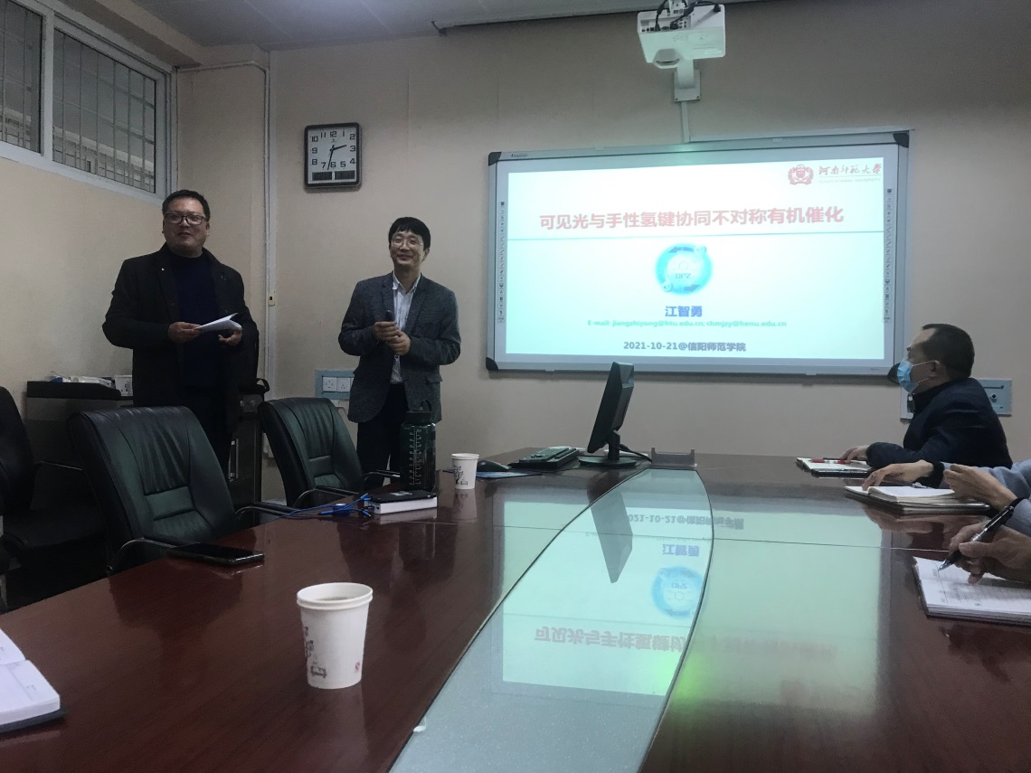10月21日,应williamhill官网邀请,河南师范大学江智勇教授在化学楼210会议室作了题为“可见光与手性氢键协同不对称有机催化”的学术报告,报告会由副院长曹俊涛主持,williamhill官网部分青年教师和研究生参加了报告会。