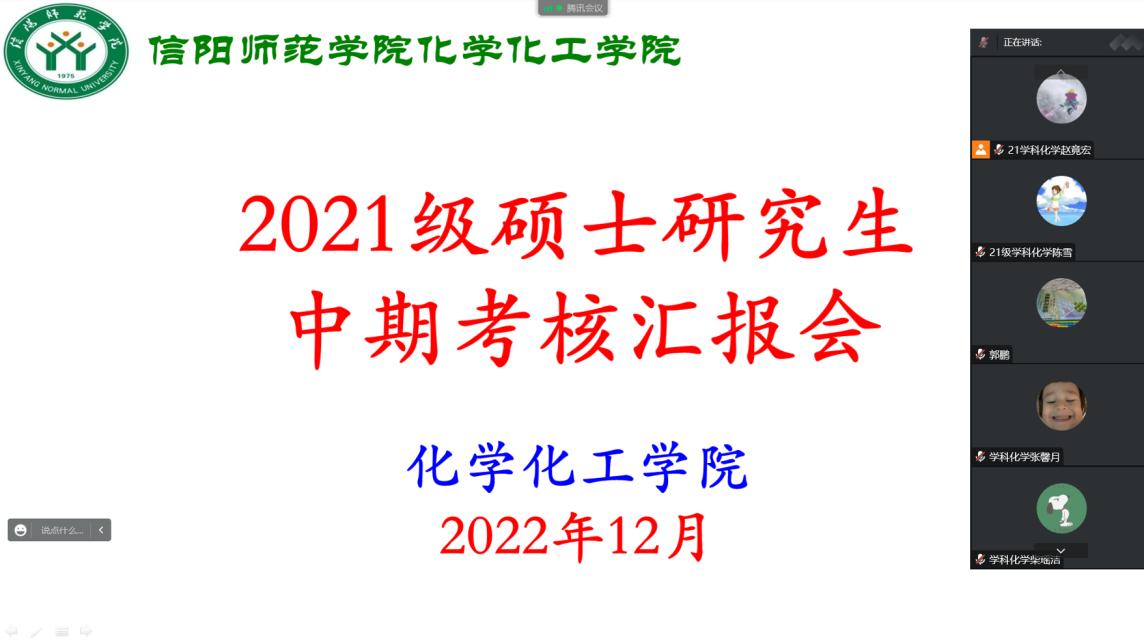 根据学校《关于做好2022-2023学年第一学期末研究生培养工作的通知》与《信阳师范学院硕士研究生培养工作暂行规定》的总体安排,12月13日,williamhill官网通过腾讯会议在线上举行2023届毕业教育硕士研究生中期考核汇报。考核组专家由刘德汞、郭鹏、王红军、朱建君、王玲玲、赵明等老师组成,汇告会由郭鹏主持。该专业全体研究生参会观摩学习。