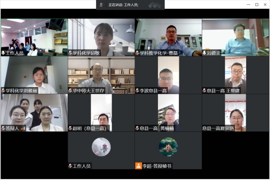 本次硕士研究生学位论文答辩会分3个小组进行,第一组包含学科教学(化学)专业硕士研究生7人,第二组包含无机化学、物理化学及有机化学方向硕士研究生8人,第三组为分析化学方向硕士研究生6人。第一组邀请了息县一高中学正高级教师赵明主任担任答辩主席,华中师范大学王世存副教授,刘德汞、郭鹏、王玲玲、王红军、朱建君等校内外导师担任答辩委员。第二组邀请了河南大学牛景杨教授担任答辩主席,井强山、刘鹏、樊阳、曹新华、饶伟浩、唐林、姜勇等校内导师担任答辩委员;第三组邀请了郑州大学屈凌波教授担任答辩主席,黄淮学院刘彦明教授,曹俊涛、甘甜、许婧、何梦媛等校内外导师担任答辩委员。