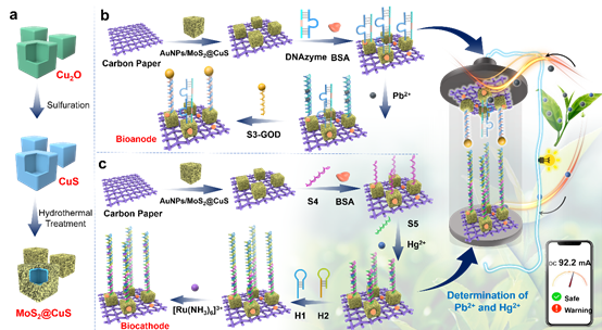 由于大多数重金属的生物降解性极低,引起的重金属离子污染对人类健康构成严重危害。目前,对于重金属离子的检测采用了许多新的方法,如表面增强拉曼光谱、原子吸收光谱、电感耦合等离子体质谱、荧光光谱、比色法、和电化学方法等。然而,与上述方法相比,自供能生物传感器由于其无需外部电源且具有较强的抗干扰能力、超灵敏的检测能力和高度可识别的特异性被广泛应用于分析检测。