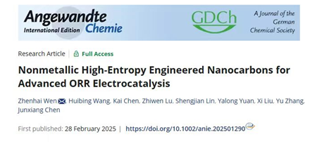 近日,我院张钰博士联合中国科学院福建物质结构研究所温珍海、陈俊翔研究团队在非金属高熵电催化材料研究领域取得了新进展,相关成果以Nonmetallic High-Entropy Engineered Nanocarbons for Advanced ORR Electrocatalysis为题,在国际知名期刊《Angewandte Chemie International Edition》上发表。该研究通过原位聚合和热解技术成功合成了一种共掺杂五种非金属元素(B、F、P、S、N)的高熵纳米碳材料(HENC)。实验表明,HENC在碱性条件下的ORR催化活性与商用铂碳(Pt/C)催化剂相当,稳定性显著优于传统催化剂。理论计算证实,多种杂原子的协同效应显著提升了活性位点密度,促进了关键中间体(*O2)的形成,而高熵结构则增强了材料抗降解能力。值得关注的是,以HENC为阴极催化剂的锌空气电池峰值功率密度达604 mW cm-2,远超商用Pt/C(542 mW cm-2),并在16天内保持稳定运行。这一成果不仅突破了贵金属催化剂的成本限制,更为锌空气电池等清洁能源技术的应用提供了关键材料支撑。