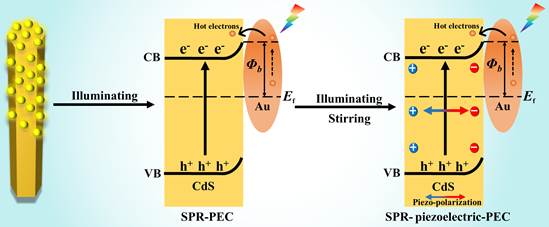 该课题组针对硫化镉基光电极可见光吸收范围窄、光生载流子复合速率快等关键问题,创新性地将压电性与表面等离子体共振(SPR)效应相结合,构建了金纳米颗粒/硫化镉纳米棒/氧化铟锡(AuNP/CdSNR/ITO)光电极,示意图如下: