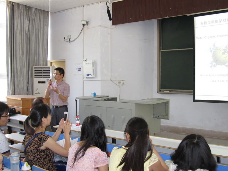 报告中,韩英锋教授首先介绍了有机金属框架材料研究的背景,接着结合自己的科研实践,讲述了有机金属框架材料的合成,有机金属框架性能的研究,基于N-杂环卡宾有机金属框架及基于N-杂环银卡宾有机金属框架的构筑,功能环状分子在小分子识别中的应用等系列问题进行了深入的探讨,并展望了有机金属框架材料研究的前景。韩英锋教授的精彩报告,赢得了台下观众的阵阵掌声。会后,韩教授与化院师生进行了亲切的交谈。