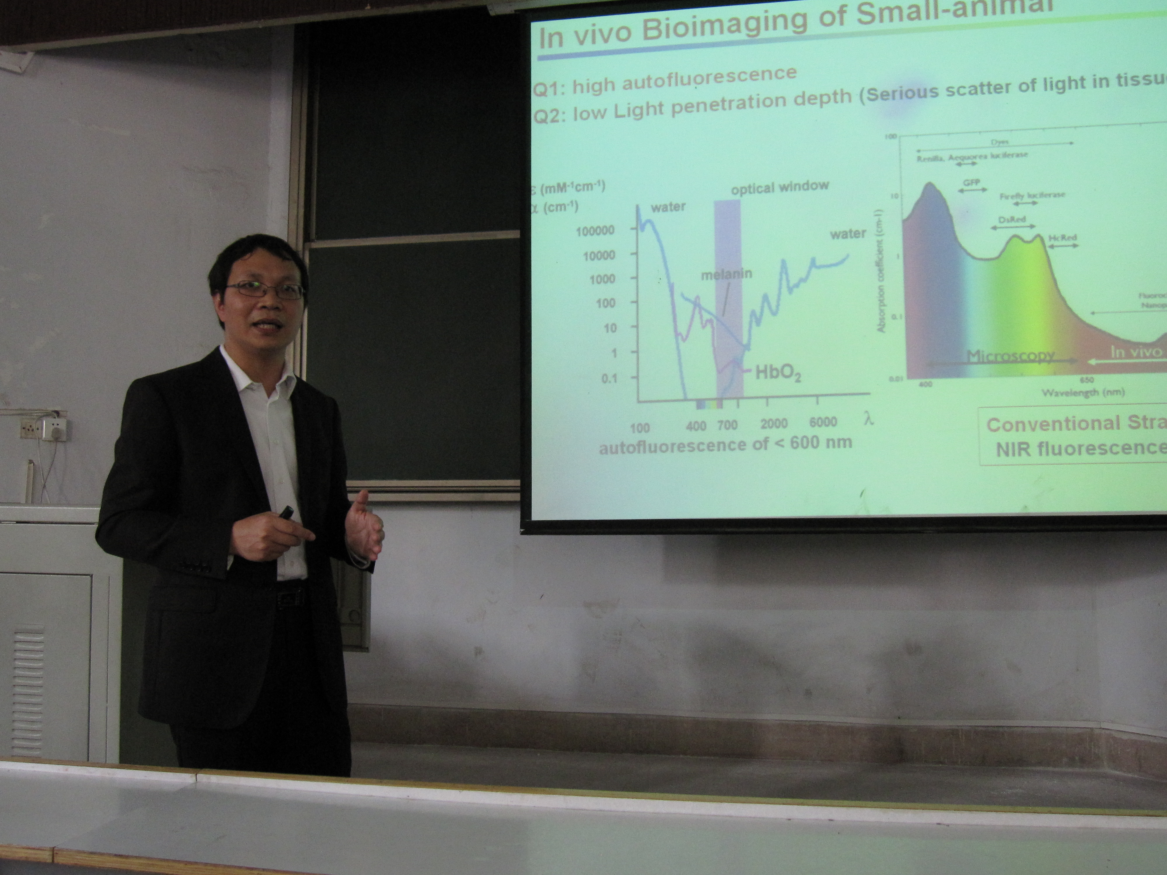 李富友教授首先介绍了什么是上转换发光材料,并从荧光探针和磷光配合物及其生物成像应用和上转换发光纳米材料及其生物医用两个方面了介绍了上转换发光材料的应用,接着对金属纳米材料和金属配合物两类上转换发光材料的优缺点进行了比较,最后介绍了一些上转换发光材料的生物应用存在的问题。李教授精彩的报告赢得了师生的阵阵掌声。会后,李富友教授与williamhill官网师生就报告相关内容进行了深入交流。