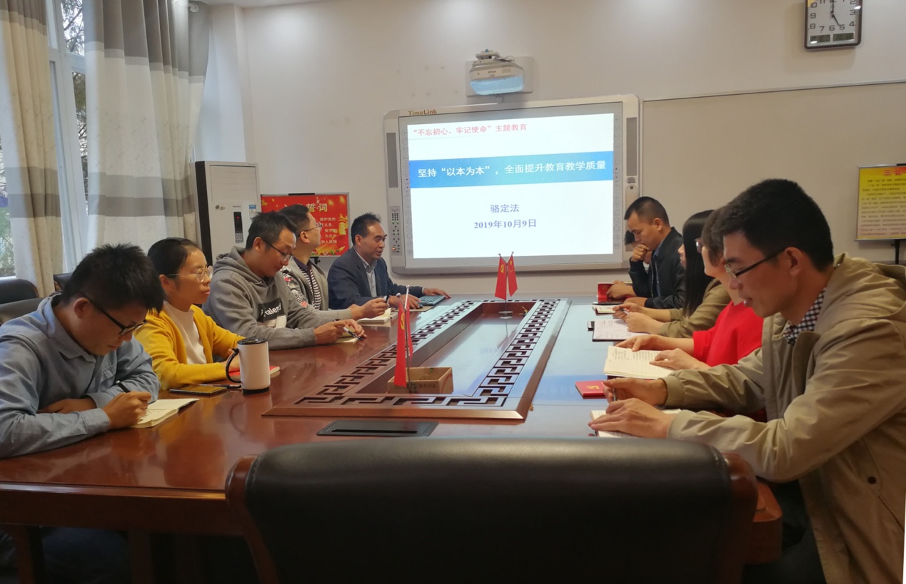 10月9日,物理化学支部和有机化学支部联合在实验楼党员之家召开“不忘初心、牢记使命”主题教育活动。活动由党支部书记师赛鸽主持,支部党员参加了本次活动。党委委员、兼职党委副书记骆定法副院长参加会议,并作“以本为本,全面提升教育教学质量”的专题党课报告。