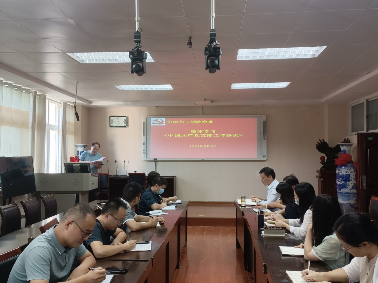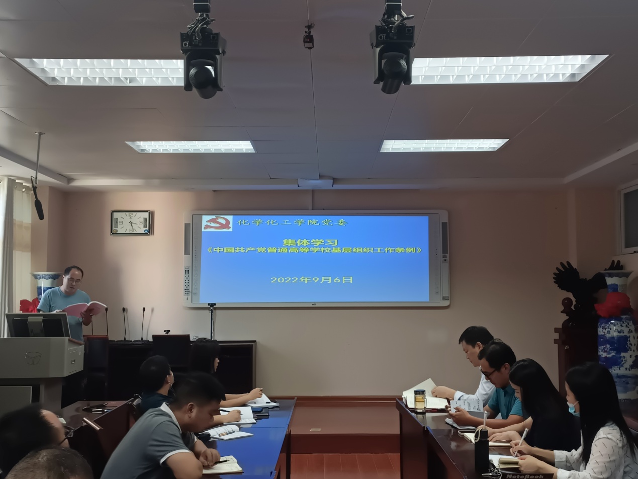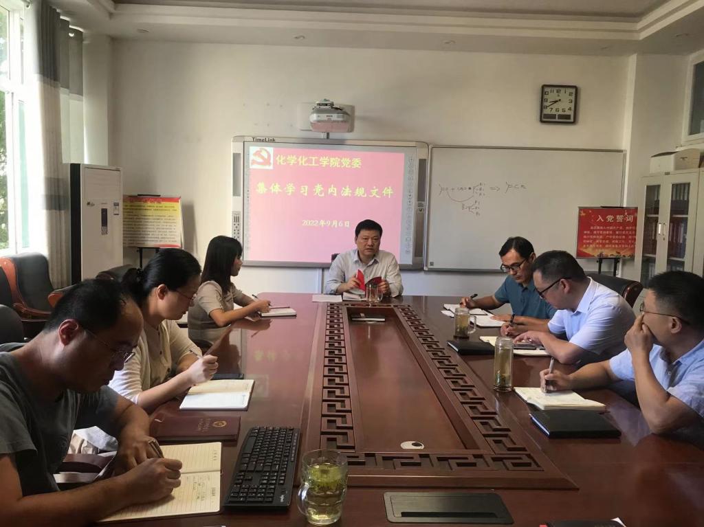 9月6日,williamhill官网党组织在化学实验楼会议室集体学习党内法规,党委书记郭鹏、副书记曲剧、副院长曹俊涛、王红军、于永生及党支部书记参加扩大学习会议。学习活动由郭鹏主持。
