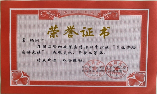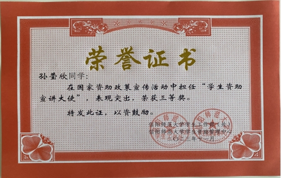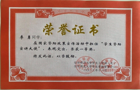 为把党和国家对家庭经济困难学生的关怀进一步落实、落细,学校学生资助管理中心利用假期时间开展送政策下乡、送政策回母校等资助宣讲活动。学院领导对此高度重视,受助学生积极报名参与,他们回母校、进社区、入村镇分发资助宣传材料,深入实地开展资助政策宣讲,用通俗易懂的语言解答学生和家长的疑问。经我校资助管理中心研究决定,授予2021级化学2班李勇同学为一等奖,2021级3班常畅同学为二等奖,2021级化学1班孙莹欣同学为三等奖。