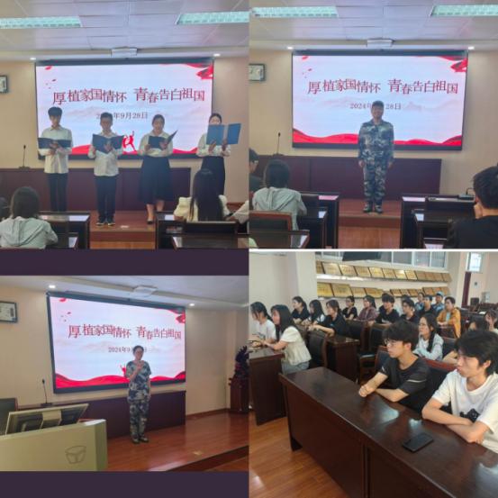 活动伊始,我院主持队成员为在场各位同学深情献颂《祖国,一首唱不完的恋歌》。他们的声音铿锵有力,充满激情,在抑扬顿挫间,诉说着祖国的伟大历程,从古老的文明到现代的辉煌,那激昂的语调,仿佛是对祖国的深情告白,表达着对这片土地的热爱与敬仰。随后,我院2024级新生同学孟烨与彭诗焕分别倾情献唱歌曲《精忠报国》与《歌唱祖国》。一曲《精忠报国》,激昂豪迈,唤起心中壮志;而那一曲《歌唱祖国》,更是见证了祖国从一穷二白到繁荣昌盛的伟大征程,凝聚着无数中华儿女的热血与奋斗!