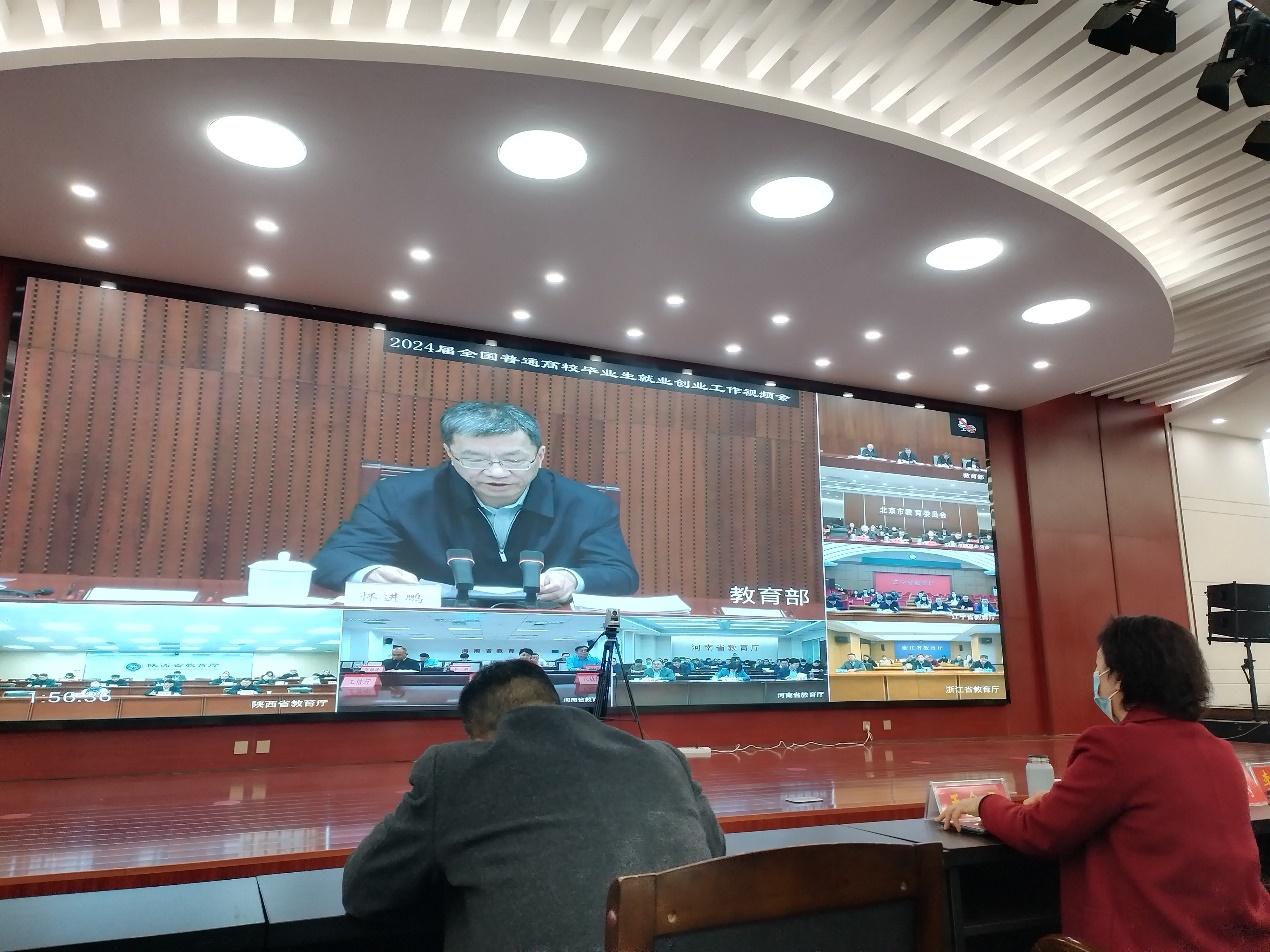 12月5日下午,教育部、人力资源和社会保障部联合召开2024届全国普通高校毕业生就业创业工作视频会议,教育部党组书记、部长怀进鹏,人力资源和社会保障部党组成员、副部长吴秀章,工业和信息化部党组成员、副部长王江平出席会议并讲话,教育部党组成员、副部长翁铁慧主持会议。校领导李俊和王金云、相关职能部门负责人在主学校会场出席会议。williamhill官网党委书记郭鹏、副书记曲剧、副院长曹俊涛、就业秘书及毕业班辅导员班主任在学校主会场收看了本次重要会议。