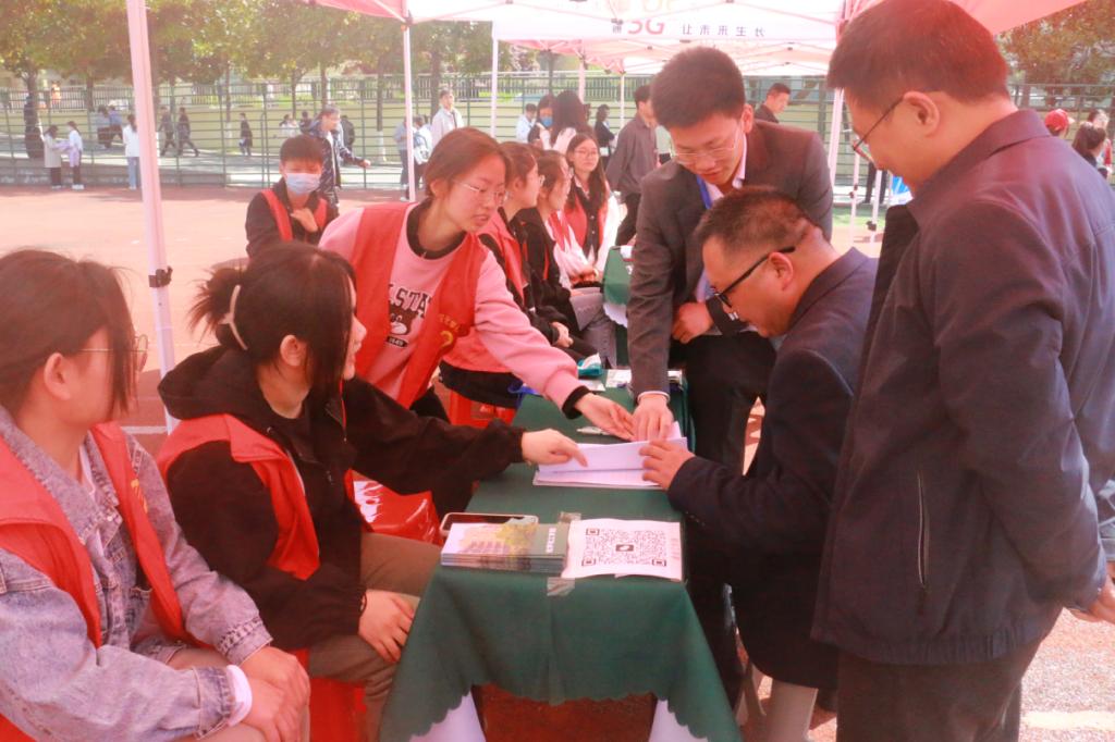 4月8日,河南省毕业生就业市场豫南分市场暨信阳师范学院2023届毕业生春季双向选择洽谈会在我校西田径场举行。williamhill官网组织毕业生积极参加招聘会,学院党委书记郭鹏,副院长曹俊涛、王红军、于永生,党委副书记曲剧,就业工作秘书严赫,毕业班辅导员赵方方、刘雪、许春萱、刘小刚、张钰等莅临招聘会现场,一线开展毕业生招聘指导、咨询服务等工作,并与用人单位及校友单位进行沟通交流。