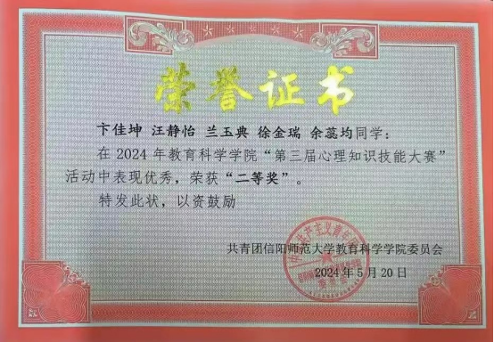 为普及心理健康知识,加强我校学生心理健康素质,提升心理育人工作质量,实现育人、育才和育心相结合,由大学生心理健康教育中心主办,教育科学学院承办的William威廉官方第三届心理知识竞赛于6月11日晚在逸夫楼团辅室举行。我院2022级卞佳坤、汪静怡、兰玉典及2023级余蕊均、徐金瑞组成的春风“化”雨,润“心”育人队参赛并荣获大赛二等奖。