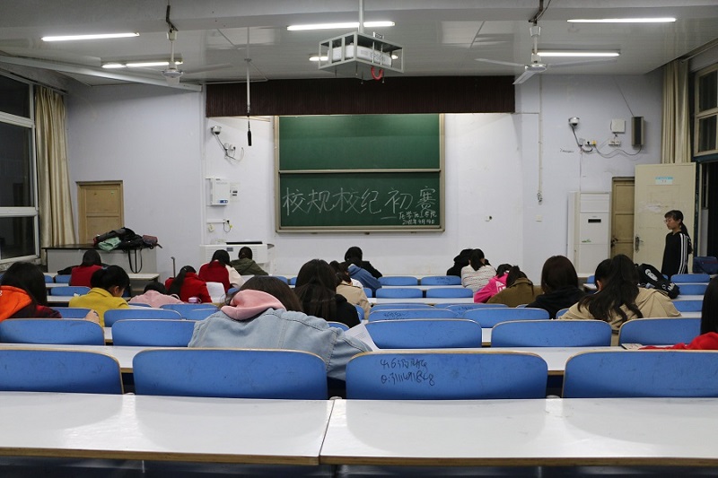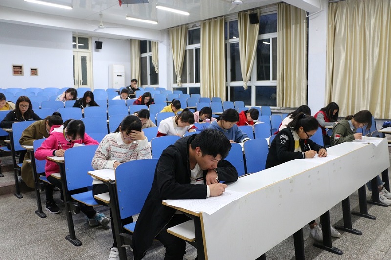 本次初赛以闭卷考试的形式考察学生对校规校纪的熟悉程度,题型有选择题、填空题、问答题,形式丰富多样。晚上7点整,考试正式开始,试卷由监考人迅速分发。参加考试的同学一接到卷子,就迅速进入状态,争分夺秒、奋笔疾书、认真答题,考场一片寂静。另有三名同学在教室前后不同位置进行监督,确保考试公平公正。半个小时之后陆续有学生交卷,至八点整所有学生均完成答题。
