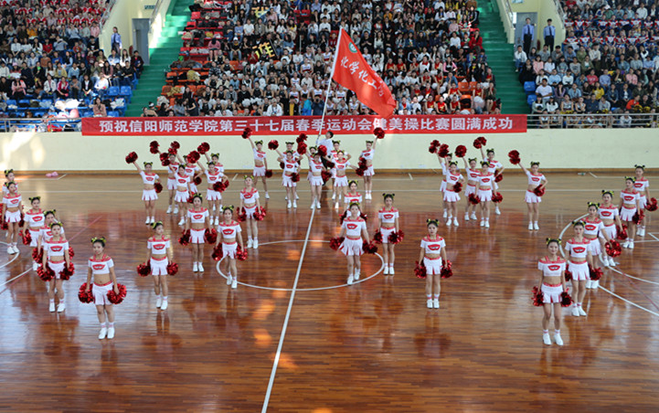 4月17日,信阳师范学院第三十七届春季运动会健美操比赛在体育馆隆重举行。赛前,校团委书记王建旭致开幕辞,随后各院系以六人一组为代表依次上场展现各院系特色风采,接着大家汇聚成方,伴着活力的音乐、踏着整齐的步伐、挥着美丽的花球,将生机勃勃的青春表现得淋漓尽致。开幕式过后,健美操比赛正式拉开帷幕。
