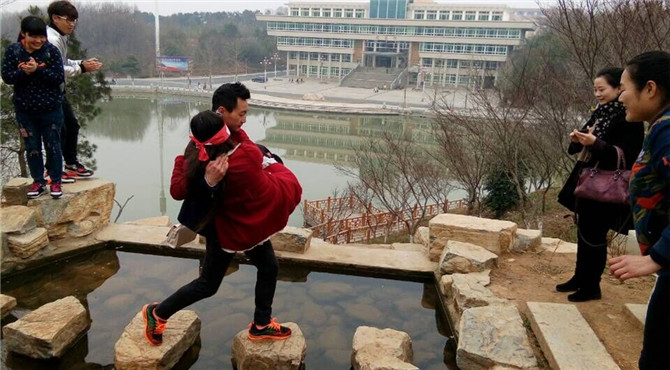 活动伊始, 一对对的搭档相互搀扶着、紧挨着、小心翼翼的向前行进。起初,有些同学不太适应黑暗,一点一点的向前挪动,通过队友悉心的呵护和正确的指引,慢慢的消除了心中的疑虑,大胆的放开了脚步,最终将自己完全的交给了搭档,任由其指挥牵引。游戏最艰难的部分,莫过于要跨过名贵园上一个小水池,水面上只有几个石墩可供通行且非常狭窄,这是对选手们智慧与力量的考验,抱着、背着、牵着、踩着各种类型的过关姿势让人捧腹大笑的同时也感动不已,期间也有人不小心落水,但在大家的鼓舞和帮助下仍然坚持完成了游戏,随着最后一组同学的抵达,活动也在热烈的掌声中进入了尾声。