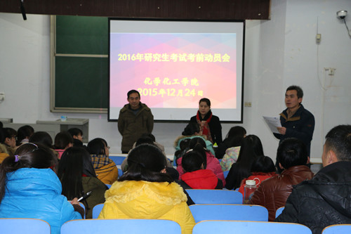 2016年硕士研究生考试在即,为保证考试前期的一些事项都能有条不紊的开展,并且为考生提供一些思想指导,我院特于12月24日下午在教四梯一开展了2016年硕士研究生考试考前动员会。本次座谈会由我院副院长骆定法教授担任主讲,党总支书记宋力主持,考研指导老师孙俊永以及150余名报考学生参加了此次座谈。