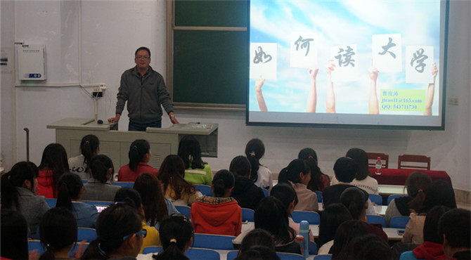 讲座伊始,曹俊涛老师通过形象生动的PPT图片显示了四年后将会出现的就业压力问题,让新生直面现实,认清自我。紧接着,曹老师以“如何在大学期间避免颓废”为话题,展开了对大学校园各种恶习的探讨,引导同学们始终坚守初衷,不负本心。曹老师语言朴实无华,一针见血,简言意骸的使同学们深刻地反思自己的现状。而后,曹老师向同学们讲述成功度过四年大学生活的四个重要方面,母校的文凭,同窗的友情,实用的技能,独立的人格。他强调,在大学期间同学们要着重培养自己独立的人格,始终保有充分的好奇心,做不一样的自己。他勉励同学们依照自己的兴趣多读书,多学一种技能,学好外语。他尤为叮嘱同学们要时常与家人通电话,向父母报平安,关心父母的生活,谆谆教诲感人深切。讲座一个小时后在热烈的掌声中圆满结束。