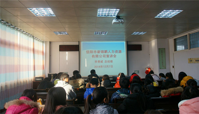 信阳市新锦鹏人力资源有限公司成立于2014年11月28日,位于信阳市浉河区信阳师范学院东门一街,是专门解决大学生创业、就业、实习、兼职等难题的可信服务平台。该公司主要业务有人才招聘、人才培训、劳务外包、人事代理、人才租赁、兼职介绍等,与世硕电子有限公司、启佳通讯有限公司、辅讯光电工业有限公司有密切合作关系。宣讲初始,公司总经理李勇斌对员工薪酬、出发流程、住宿条件、返校安排等做了详细介绍。随后,招募员杨帆针对大学生面试技巧、人际交流、职业规划等问题分享了他个人的经验,并和同学们展开了互动,一一解答了同学们在求职过程中遇到的各类问题。最后,李总郑重承诺在工作期间将派公司专人陪同全程跟踪服务,解决同学们在日常生活中遇到的一切疑难问题。至此,历经两个多小时的会议圆满落下帷幕。