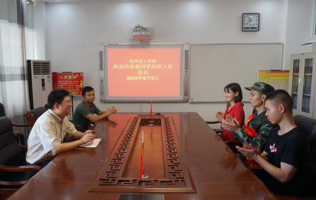 9月9日上午11:00,williamhill官网2019年入伍学生欢送仪式在化学实验楼313会议室举行。williamhill官网党委副书记吴志伟,党委秘书冷向宇,武装干事邓耀辉,新入伍同学和两名退伍复学同学共同参加了欢送仪式。