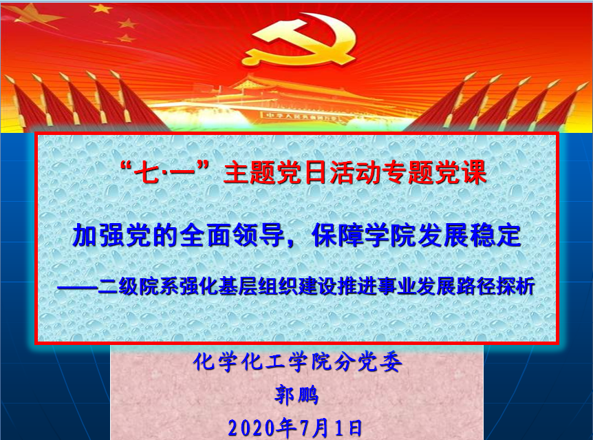 7月1日下午,学院党委书记郭鹏为师生党员讲授了《加强党的全面领导,保障学院发展稳定》的七·一专题党课。党课报告上,郭鹏围绕坚持中国共产党全面领导,结合“坚持党对一切工作的领导是中国共产党的必然选择”“坚持和完善党领导一切工作的制度”“不断提高党对一切工作的领导能力”“二级学院强化党的领导保障事业发展路径”等几方面,从历史与现实、国内与国外、理论与实践、基层的体会等几个维度进行了深入浅出地讲解。他表示,在中国共产党的领导下,党员同志要更清楚地把握“百年未有之变革”进程中中国抗疫的大国担当、东西两种意识形态的持久对抗、以儒家文化为代表的东方治理模式、世界多极发展等方面的“变”化要素,厘清全球化大势、亚太区域发展重要性、中国和平崛起、新工业革命浪潮等方面的“不变”趋势。这次抗疫斗争充分彰显了新时代以习近平同志为核心的党中央驾驭复杂面的高超水平和担当,充分彰显了社会主义制度的巨大优越性,他要求,全体党员教师要更加坚定对马克思主义、中国共产党领导、中国特色社会主义道路的政治认同、理论认同、情感认同,将“小我”积极融入“大我”之中,以高校知识分子的家国情怀,以党员的初心使命积极投身中国特色社会主义伟大实践,为奋力实现“两个一百年”的奋斗目标和中华民族伟大复兴的中国梦而贡献智慧和力量。