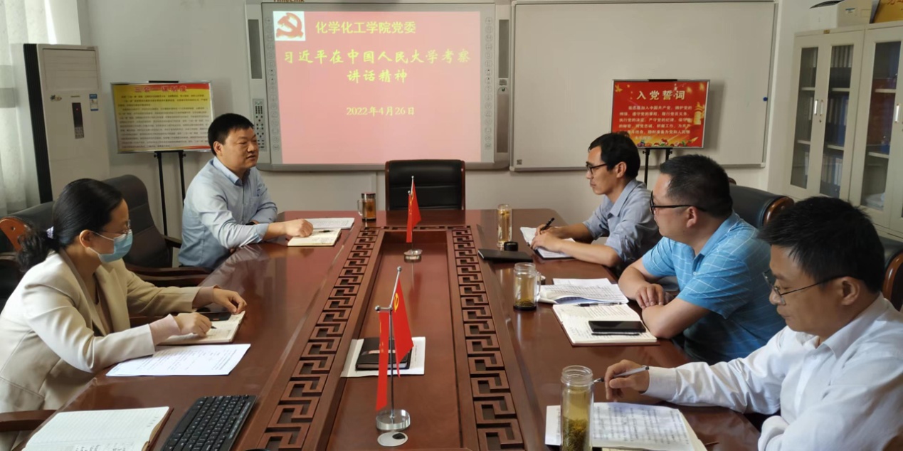 会上,党委委员、专职组织员冷向宇同志领学了习近平总书记在中国人民大学考察的重要讲话《坚持党的领导传承红色基因扎根中国大地走出一条建设中国特色世界一流大学新路》(人民日报2022年4月26日第1版)。