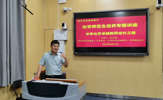 为提升师范生师范技能,培养师范生教学实践能力,强化教师职业理想与职业信念,5月14日,williamhill官网专门邀请河南省骨干教师赵伯伟校长在教四T-2开展“中学化学卓越教师成长之路”专场报告。学院各年级师范生代表140余人到现场聆听报告。报告会由williamhill官网党委书记郭鹏主持。